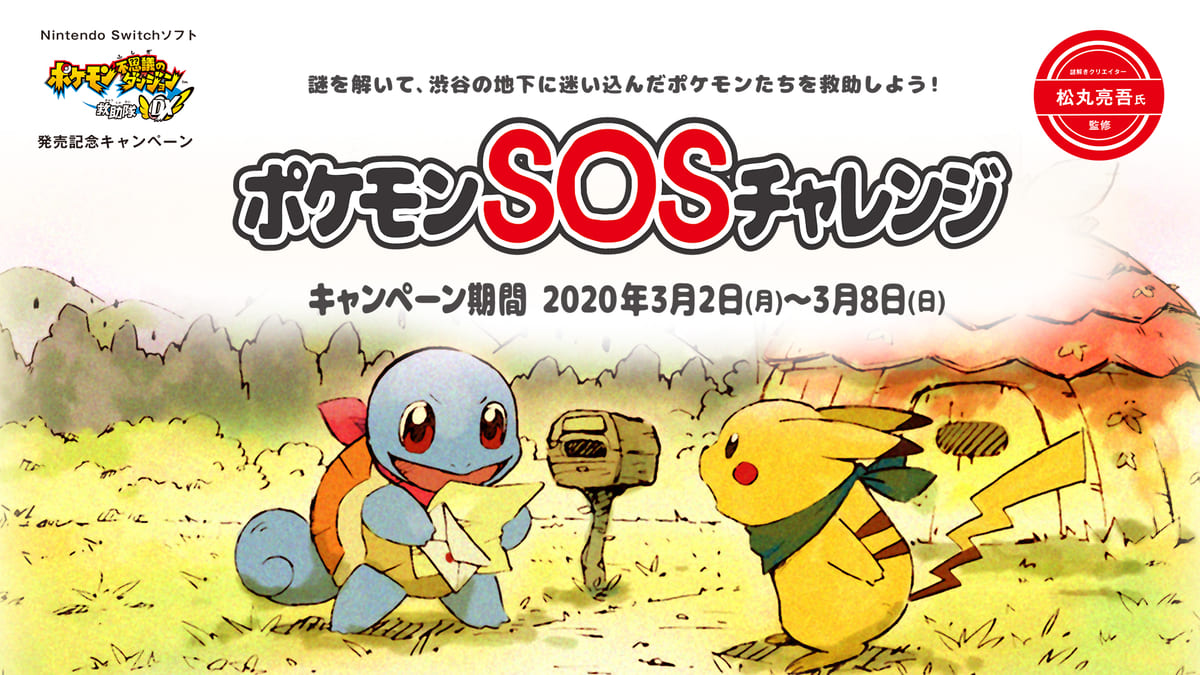 Nintendo Switchソフト『ポケモン不思議のダンジョン救助隊DX』の発売を記念して、2020年3月2日(月)より、謎解きクリエイター松丸亮吾さんが監修した謎解きに答えてポケモンを救助する企画「ポケモンSOSチャレンジ」を開催!