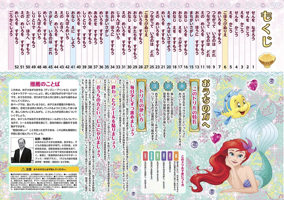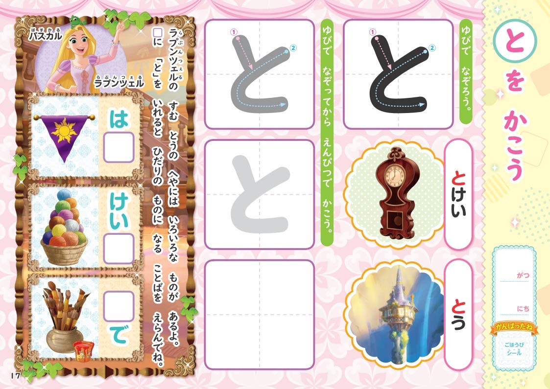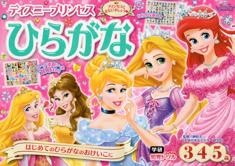大好きなディズニープリンセスといっしょに、楽しくひらがなを学習できるドリル。