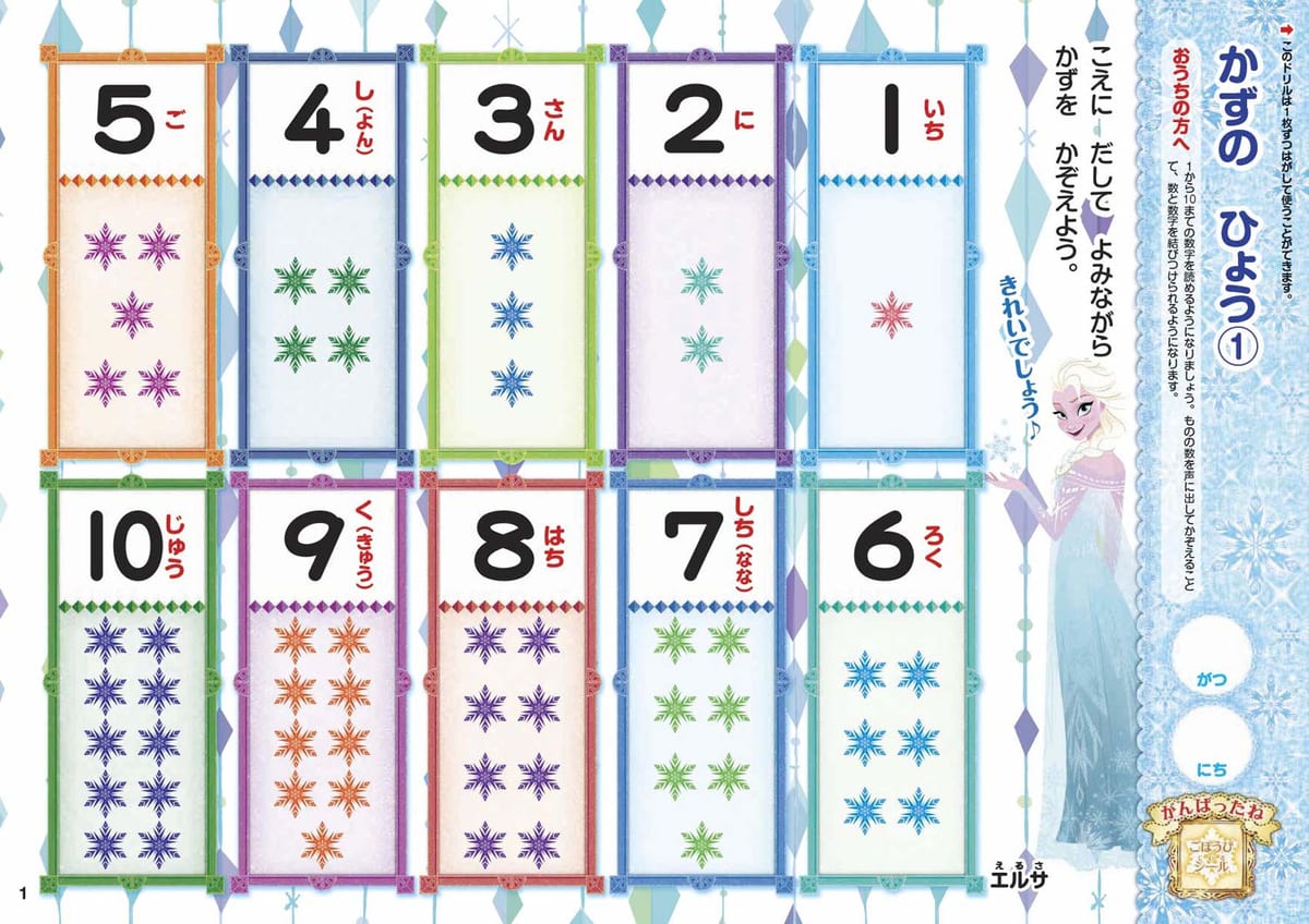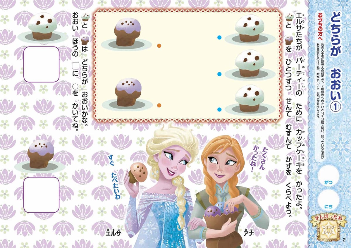 「アナ」や「エルサ」たちと一緒に楽しみながら“かず”の学習ができるドリル。
