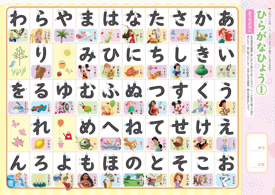 さらに、清音、濁音、半濁音を網羅したひらがな表には、ディズニーの世界にまつわる言葉と絵がついています。