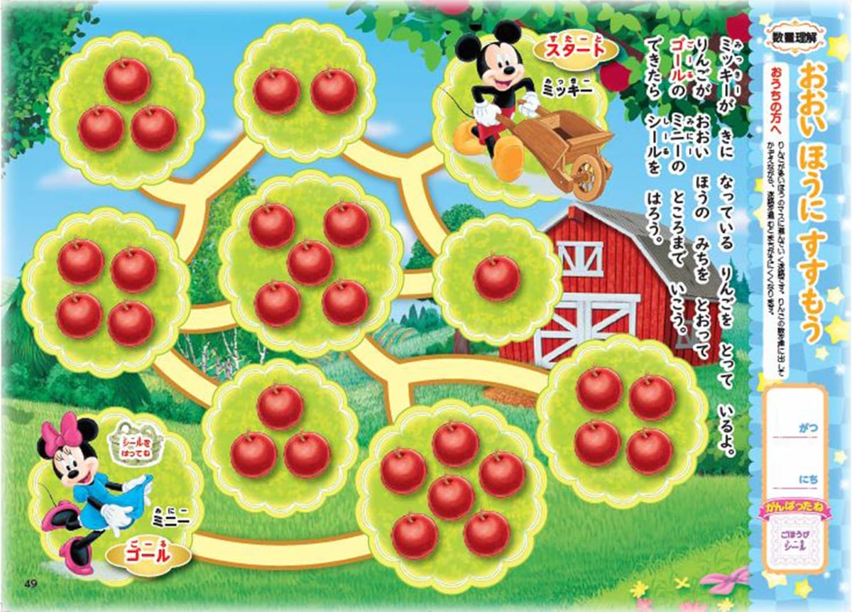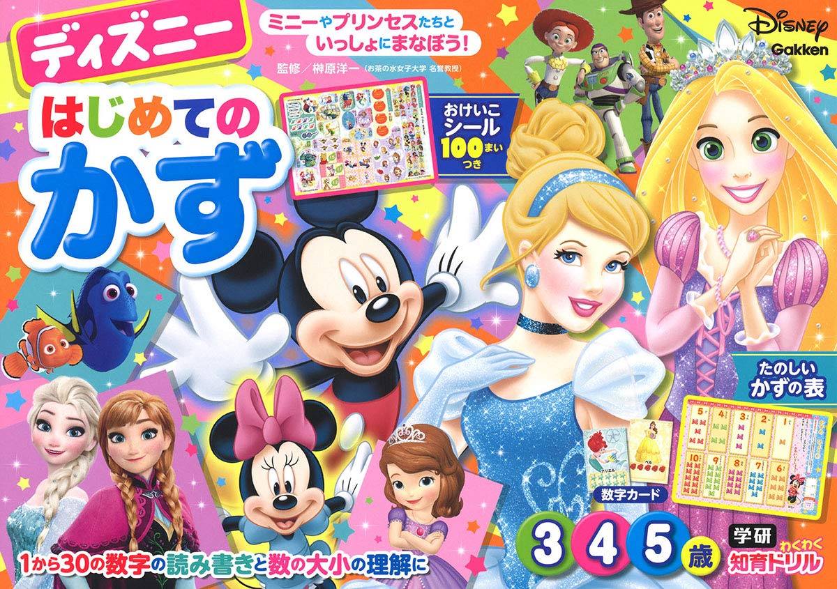 「ミッキー」や「ミニー」、ディズニープリンセスや『アナと雪の女王』や『ちいさなプリンセス ソフィア』に登場するキャラクターたちと一緒に“かず”が学べるドリル。