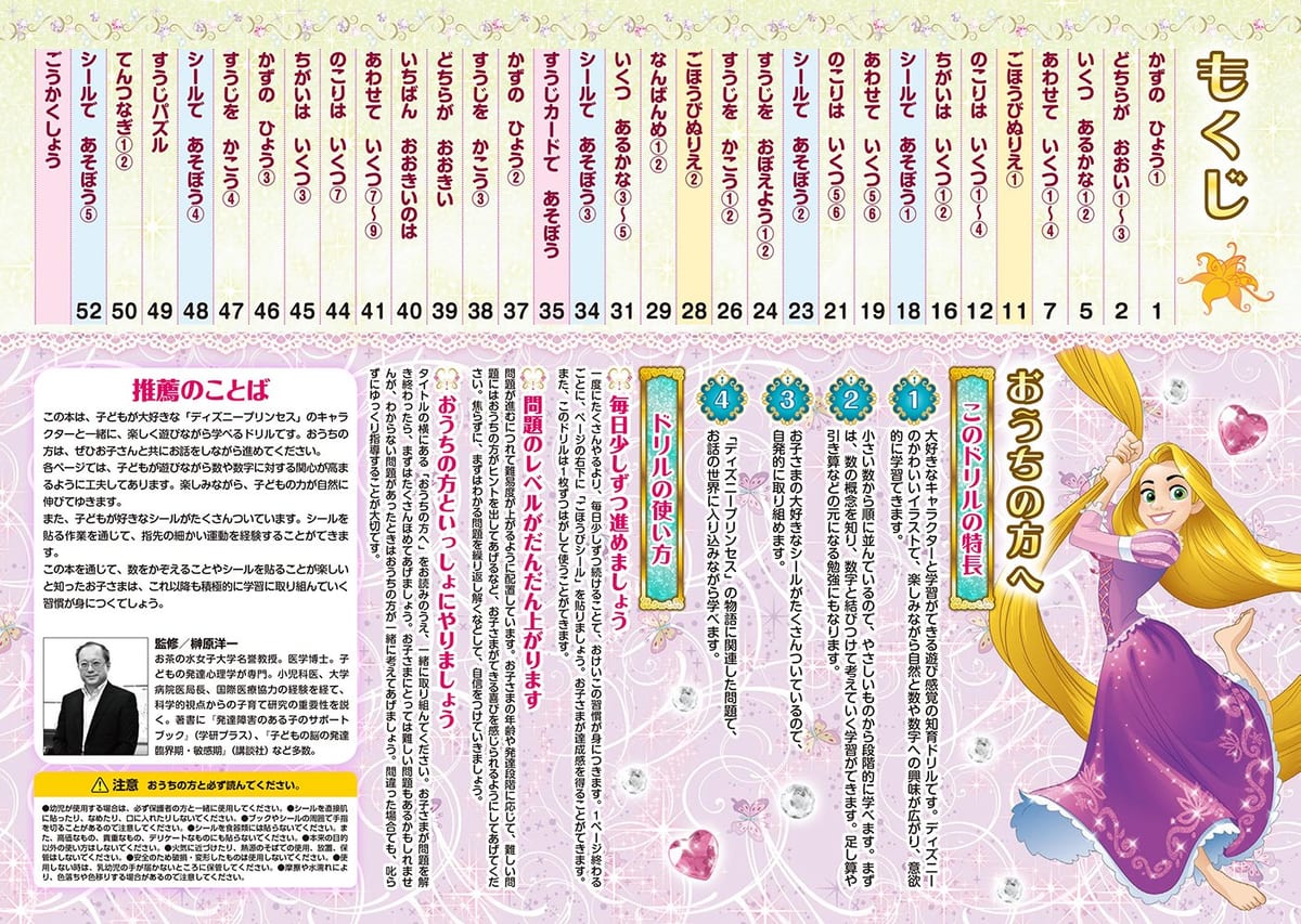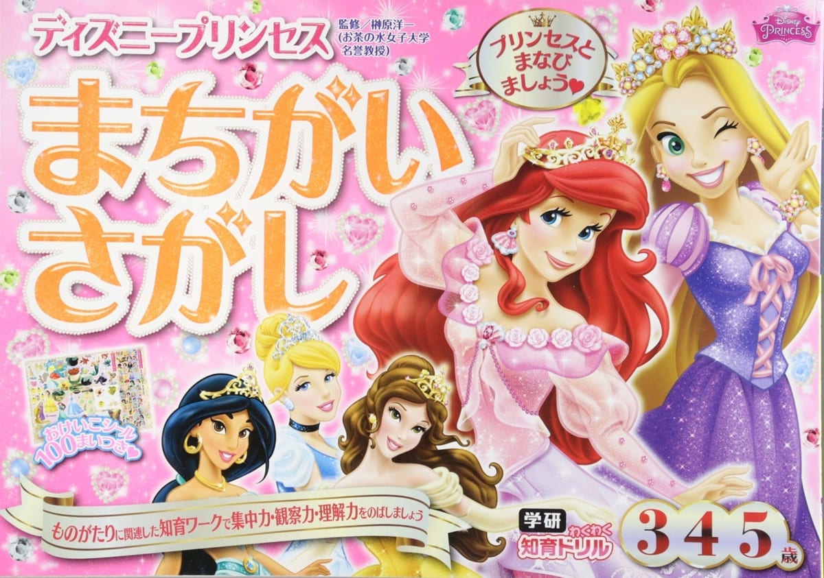 『塔の上のラプンツェル』の「ラプンツェル」や、『シンデレラ』の「シンデレラ」など、ディズニープリンセスと一緒に学べる知育ドリル。