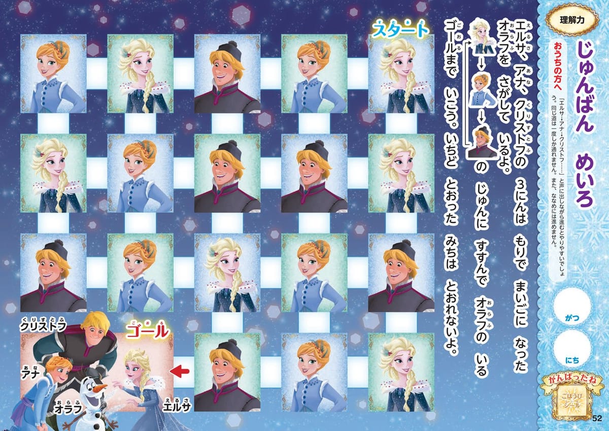 「アナ」や「エルサ」たちといっしょに楽しみながらおけいこできるめいろ。
