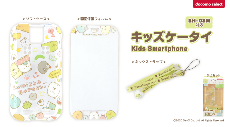 キッズケータイ(SH-03M)専用「すみっコぐらし」のソフトケースが、全国のドコモショップとドコモオンラインショップにて販売中です。