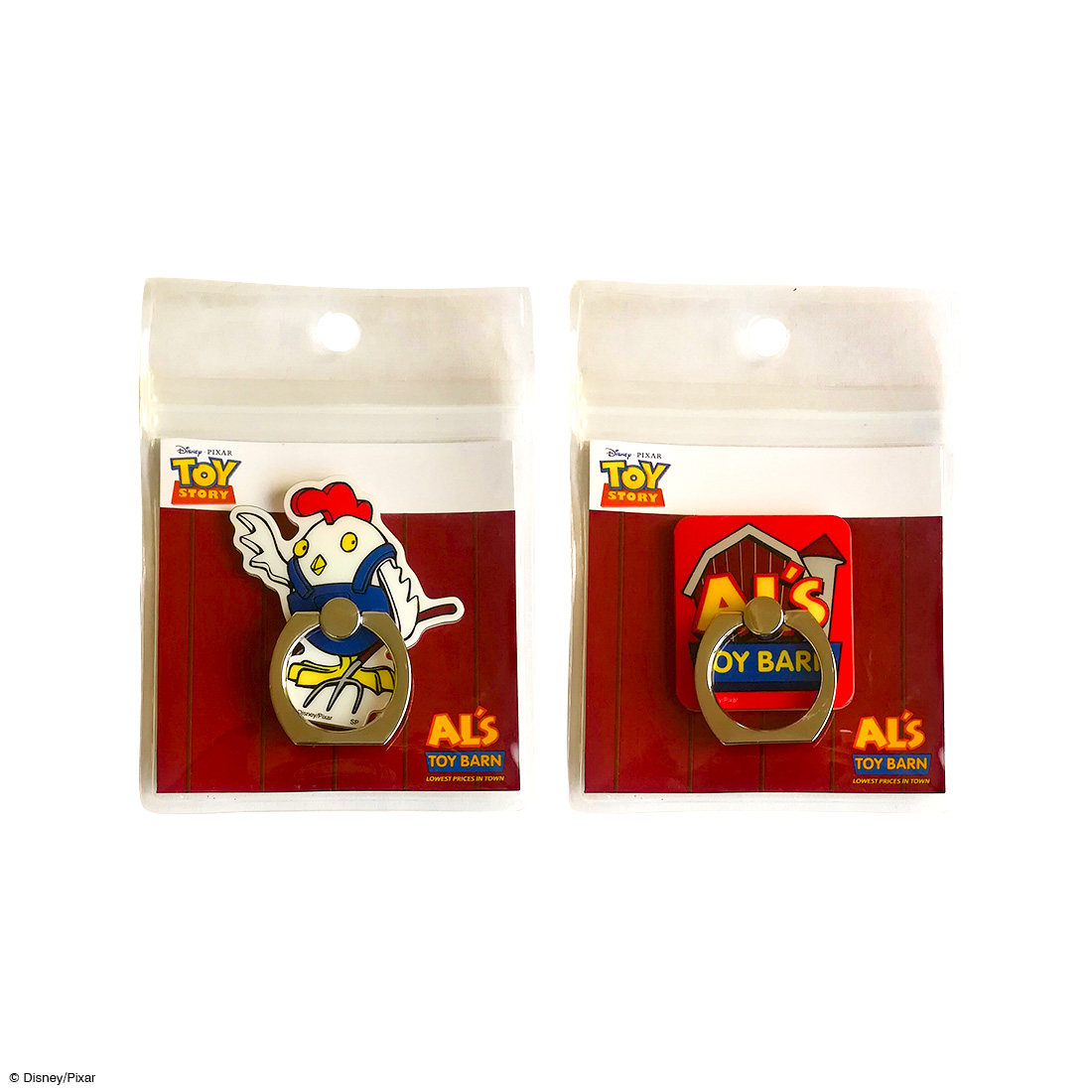 「AL'S TOY BARN」のマスコットとロゴデザインのスマートフォンリング。