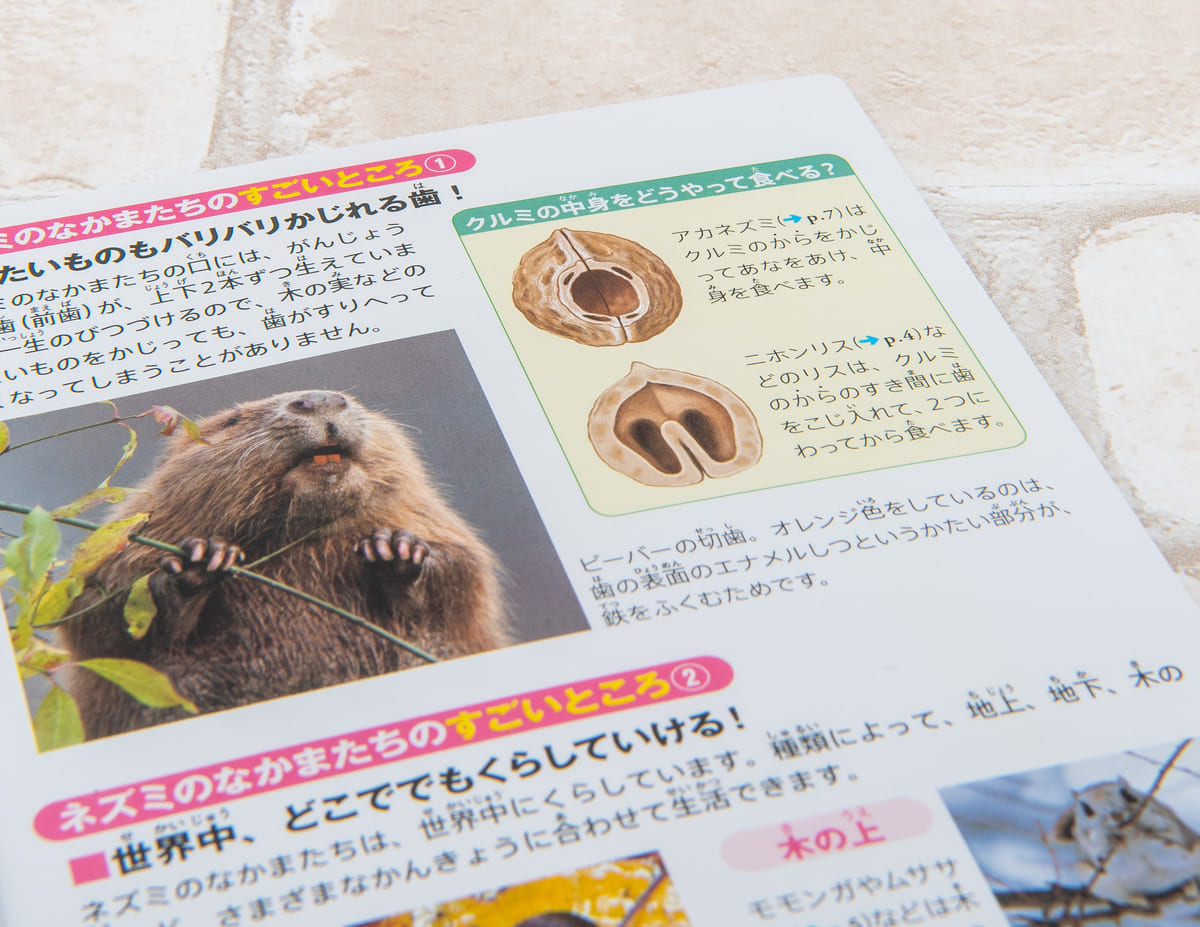 絵本はやさしい手触りの素材を使用している一方で、図鑑は光沢感のある紙を使用した美しくリアルな写真が魅力です。