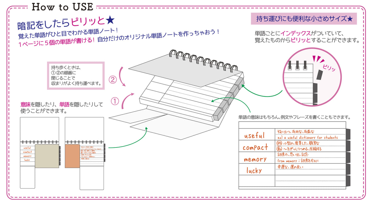 持ち運びに便利な小さめサイズながら、1ページに5個の単語が書けるのもポイント☆