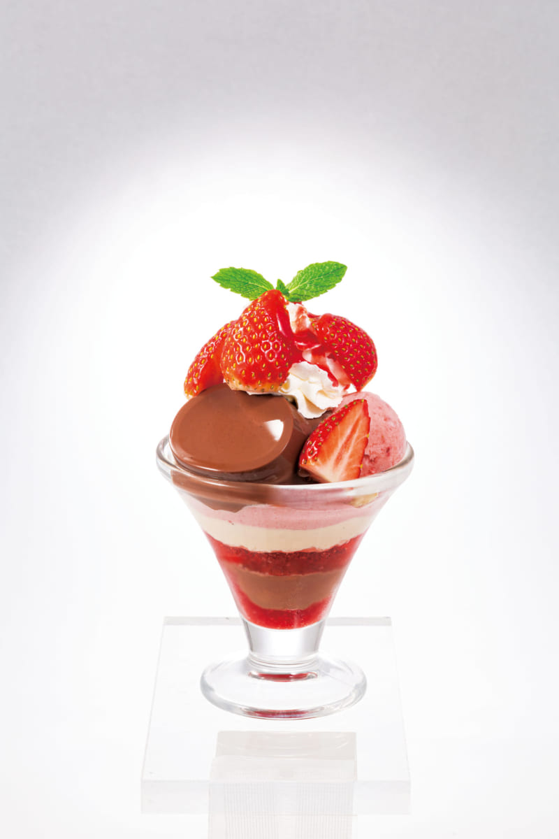 グラスの中に重ねた苺ソースや苺クリーム、苺ゼリー、苺ソルベなど、様々な素材に変身した苺が、みずみずしい果実の美味しさを引き立てます。
