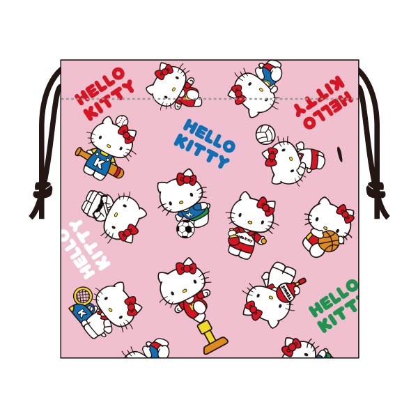 「ハローキティ I LOVE SPORTS!」スポーツ パターンデザインの巾着。