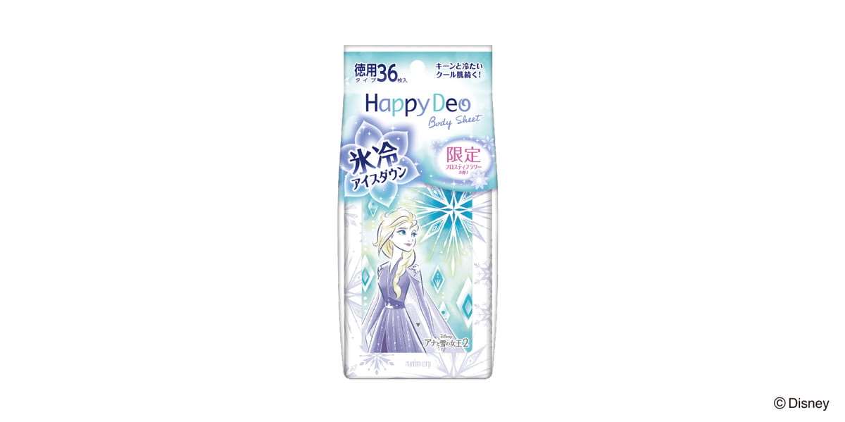 今回発売される新商品では、ハッピーデオ ボディシートの中でも、氷のように冷たい使用感が人気のアイスダウンタイプのパッケージに、『アナと雪の女王2』の劇中と同じドレスを着た「エルサ」がデザインされています。