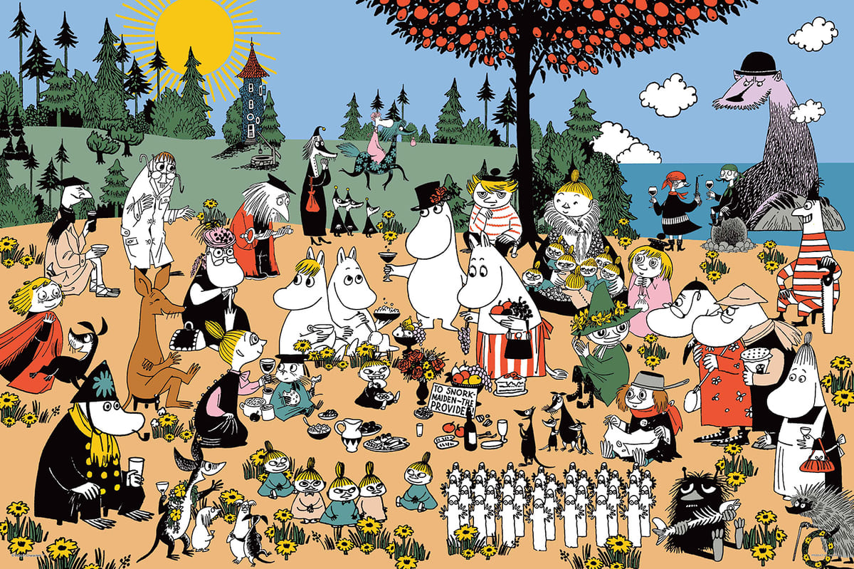 ムーミンやスナフキンなどメインキャラクターも、知る人ぞ知るマイナーキャラクターも、リンゴの木の森に集まって大騒ぎ。