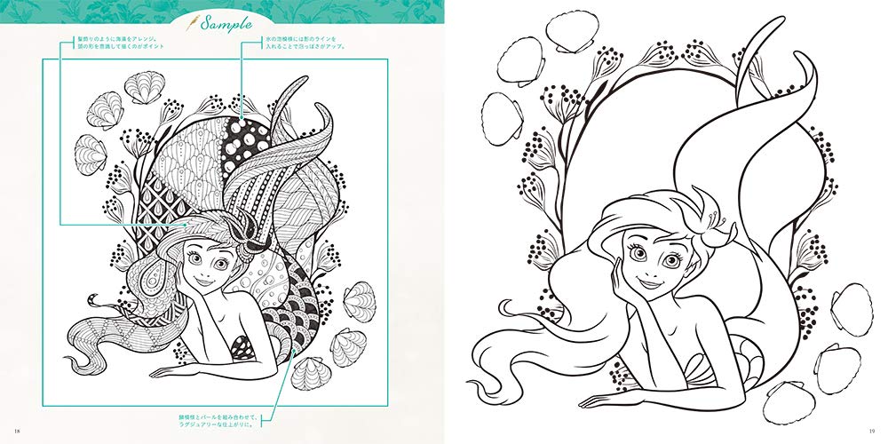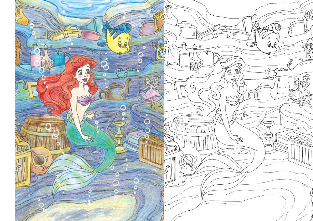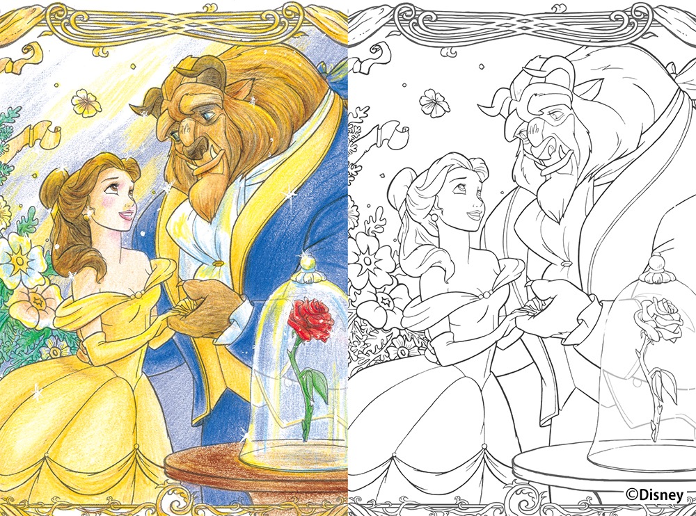 塗り絵の図案はすべてオリジナルで、ディズニープリンセス『美女と野獣』、『塔の上のラプンツェル』、『シンデレラ』、『白雪姫』、『リトル・マーメイド』、『眠れる森の美女』、『アラジン』のとろけるような憧れのラブシーンを収録。