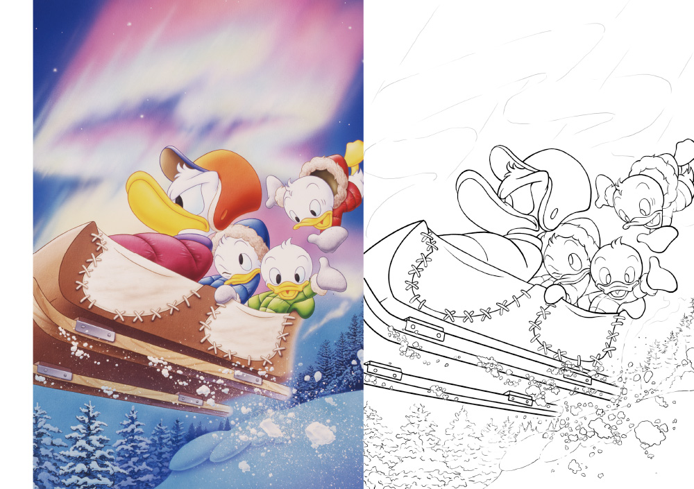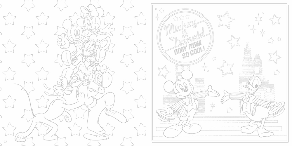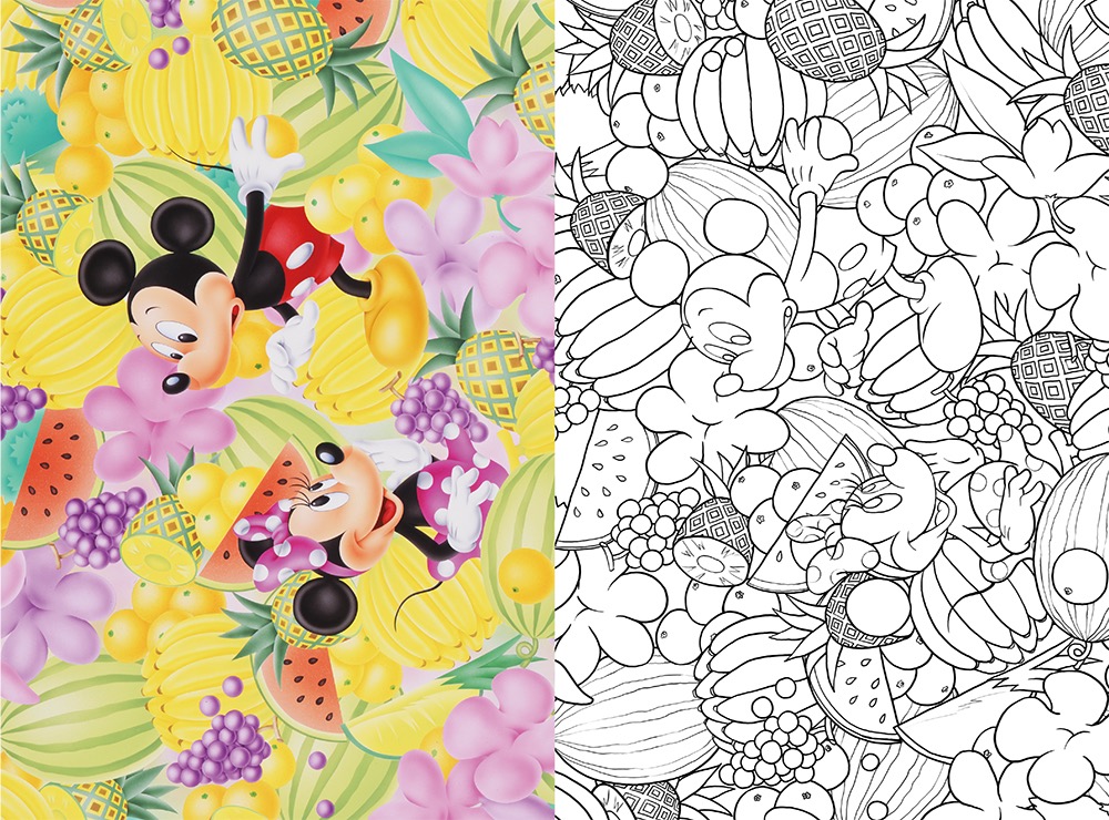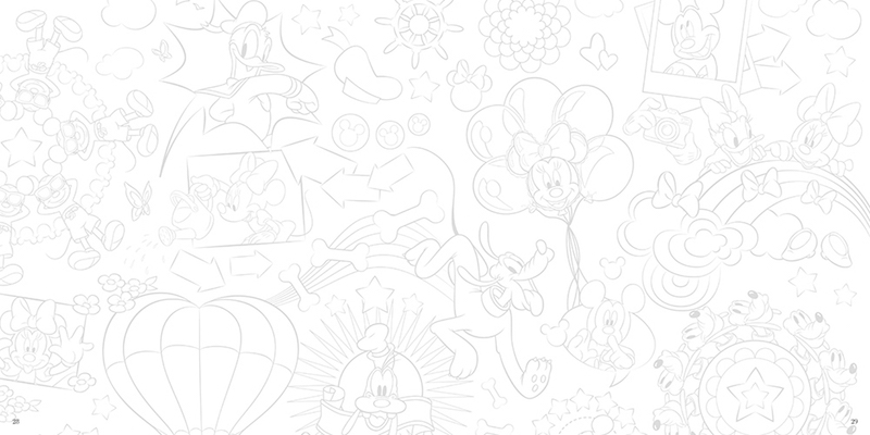 塗り絵図案は、「ミッキー&フレンズ」を中心に、『アラジン』、『リトル・マーメイド』、『シンデレラ』のディズニープリンセス、『くまのプーさん』、『アナと雪の女王』、『ダンボ』、『ふしぎの国のアリス』、ディズニー/ピクサー作品から『トイ・ストーリー』、『カーズ』、『ファインディング・ニモ』などの作品から躍動感を感じるシーンが収録されています。
