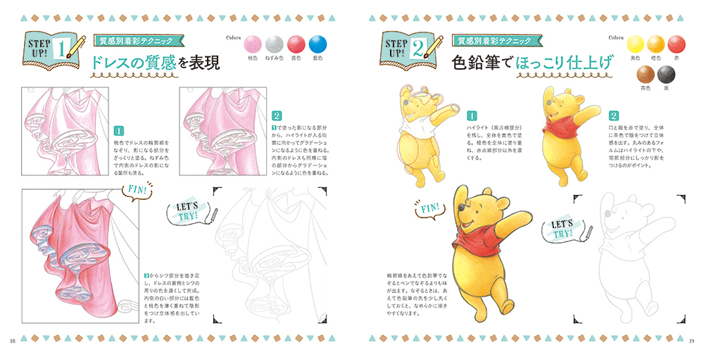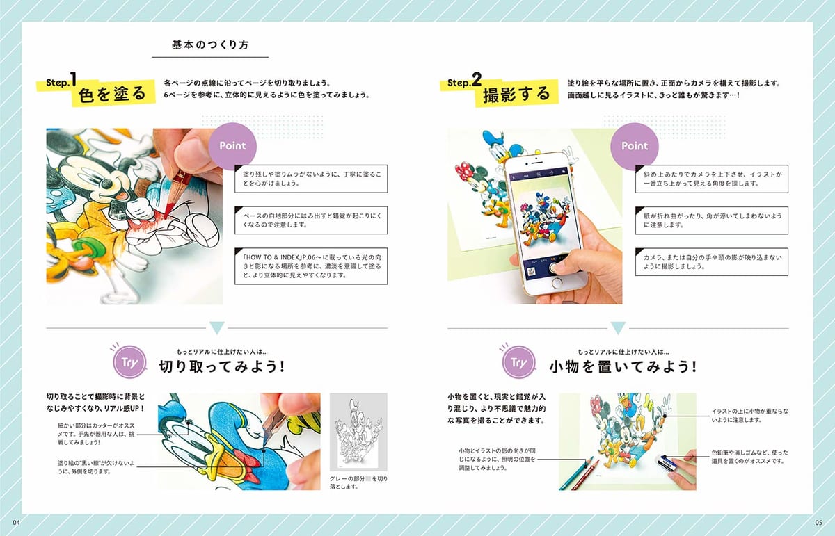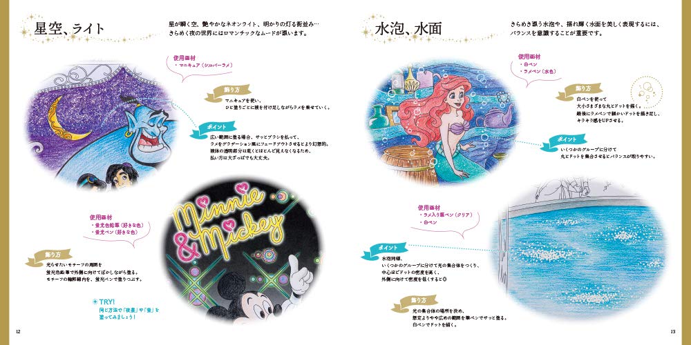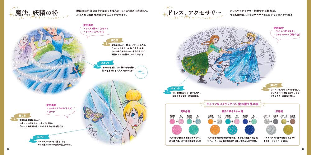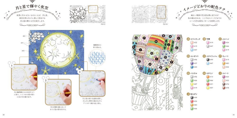 さまざまな演出方法が満載なので、これから塗り絵をはじめる方もディズニーの世界を存分に楽しめます。