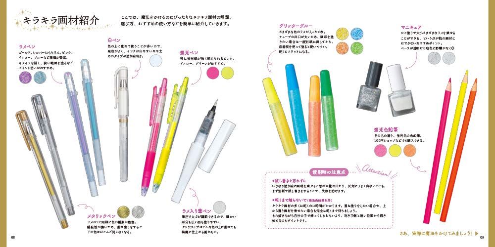 キラキラ画材で仕上げるテクニックも掲載されています。