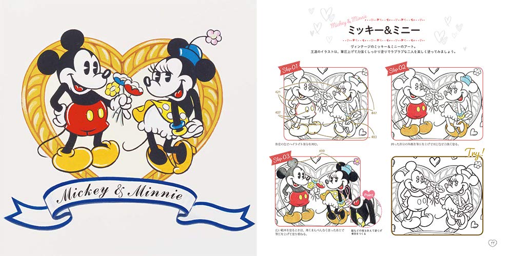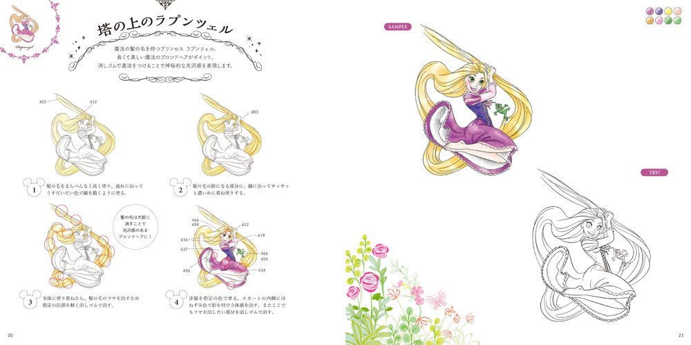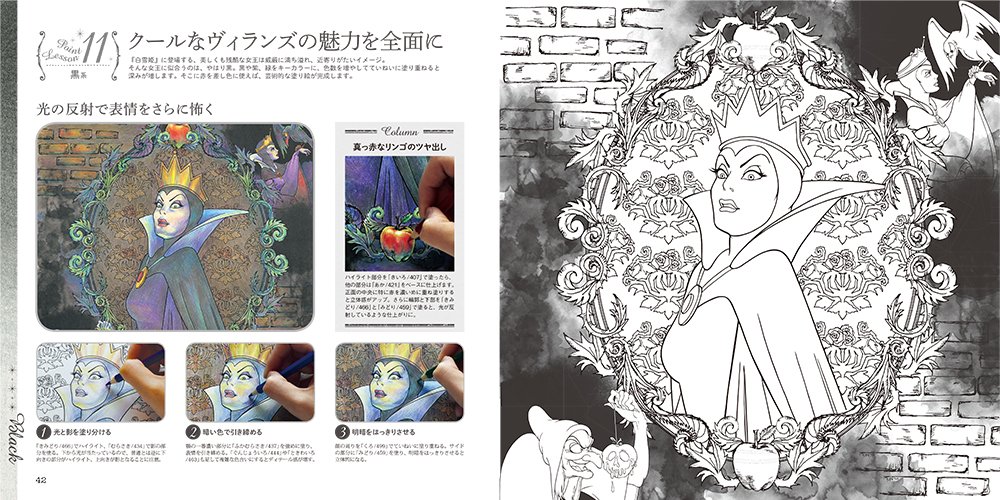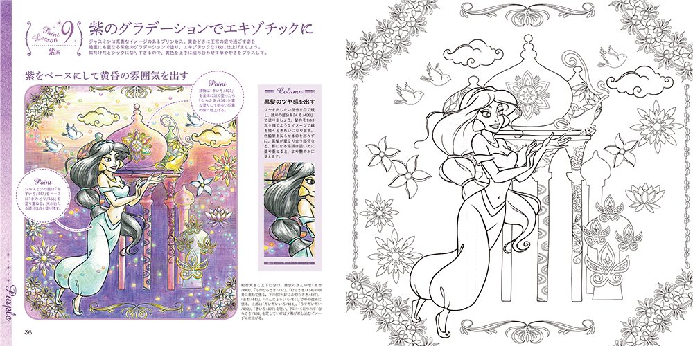 キャラクターの塗り方やディズニーの世界観を表現するテクニック解説付きの塗り絵。