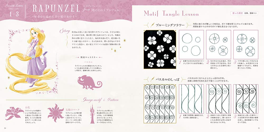 タングルアートの基本の描き方やポイント、そしてディズニープリンセスのキャラクター紹介と、各キャラクターのイメージタングルの描き方のレクチャー。