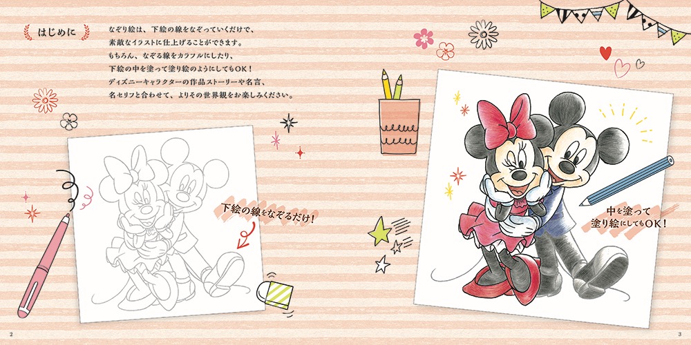 塗り絵集は、「ミッキー&ミニー」、「ドナルド&デイジー」のデートシーンをはじめ、「ミッキー&フレンズ」のファンタジックなワールド、ディズニープリンセスの愛あふれるイラストなど盛りだくさん!
