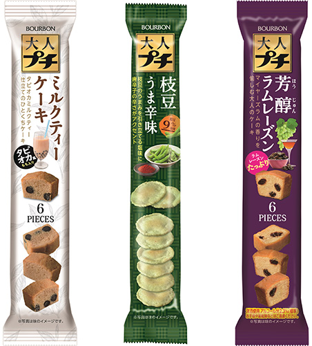 ブルボンの大人の上質感を高めた大人プチシリーズに「ミルクティーケーキ」と「枝豆うま辛味」が加わります!