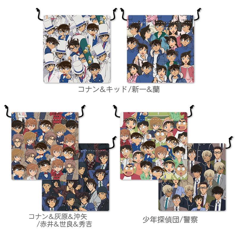 キャラクター総柄デザインの2枚の巾着セットで、人気の高い「コナン&怪盗キッド」や赤井ファミリーなどのデザインもラインナップされています☆