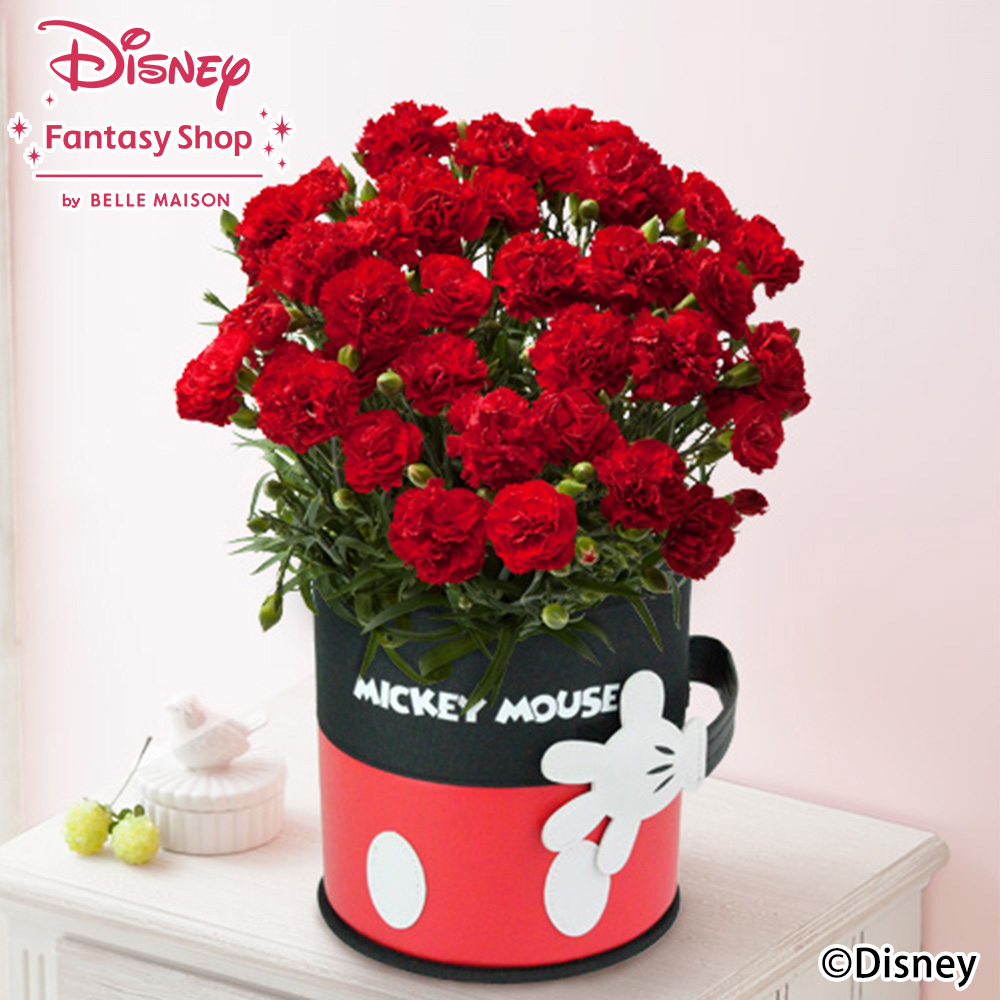 そんな定番の赤いカーネーションをミッキーデザインのバスケットに入れた母の日のギフトにぴったりの鉢植え「カーネーション グランルージュ/ミッキーマウス」