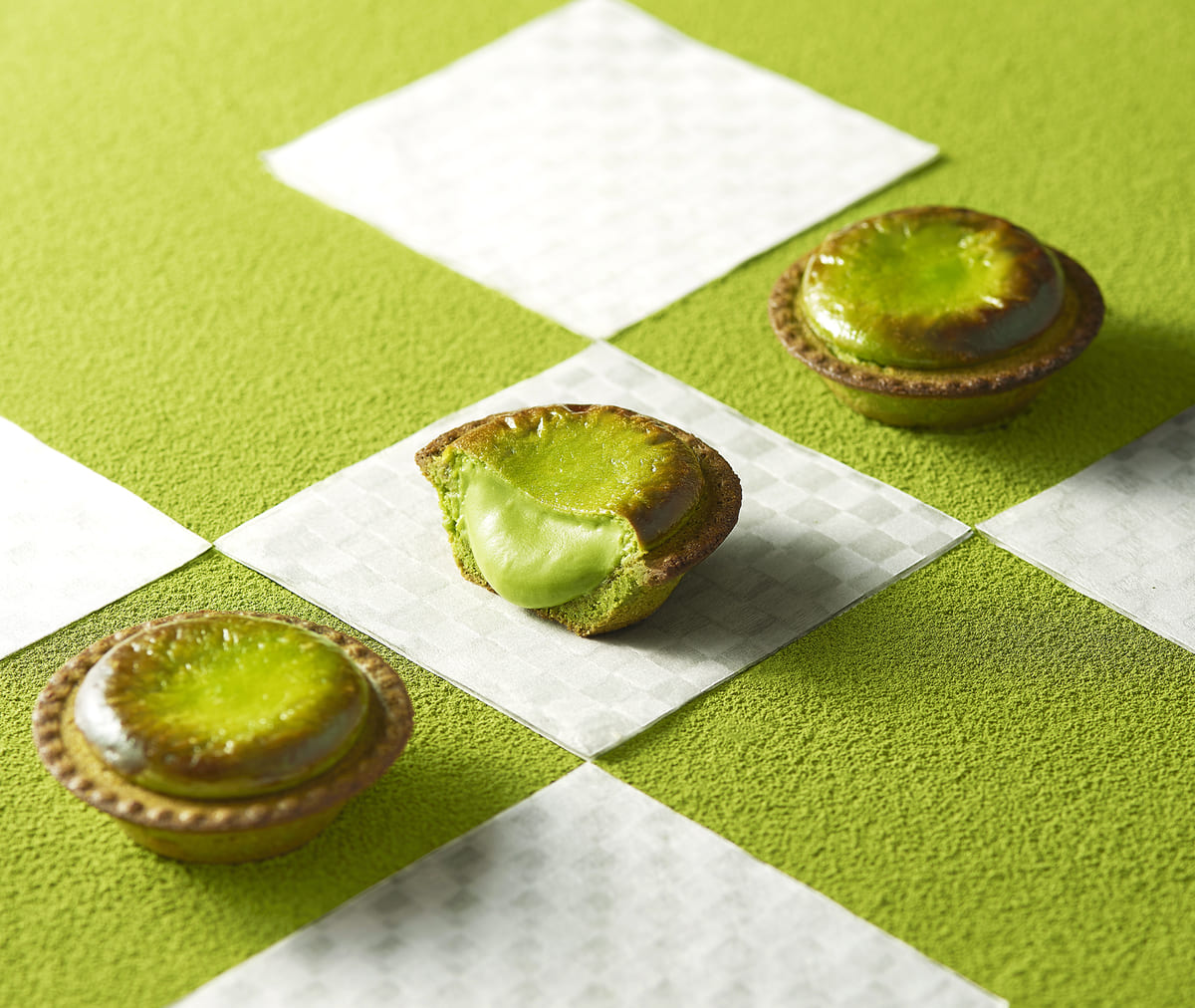 抹茶の配合を「焼きたて抹茶チーズタルト『深緑』」と「焼きたて抹茶チーズタルト『涼』」の中間にすることで、チーズのクリーミーな風味と抹茶のほろ苦い味わいをさらにバランスよく仕上げられています。