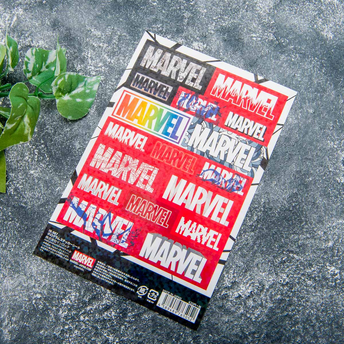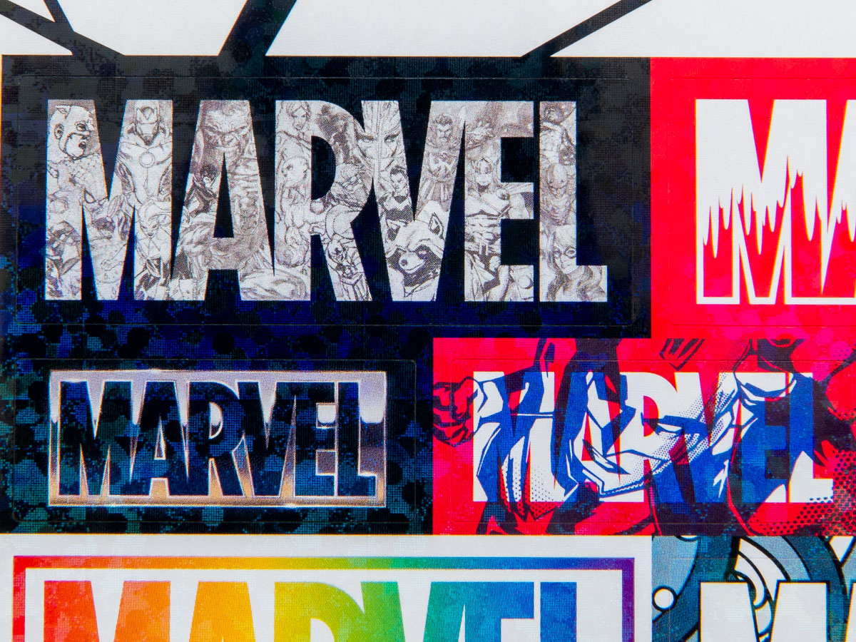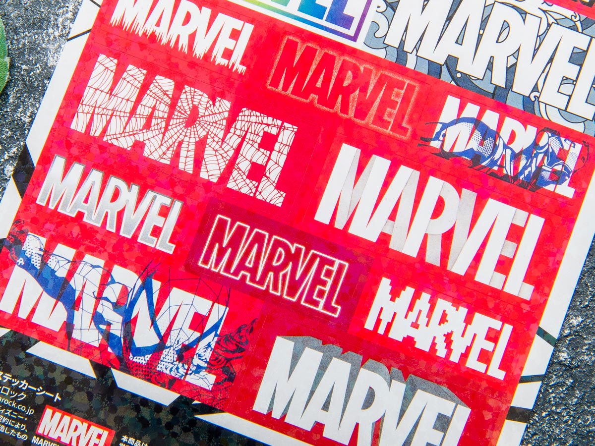 「MARVEL」のボックスロゴの中にお馴染みのヒーロー達がデザインされたステッカーや、メタル風のアートなどどれも魅力的!