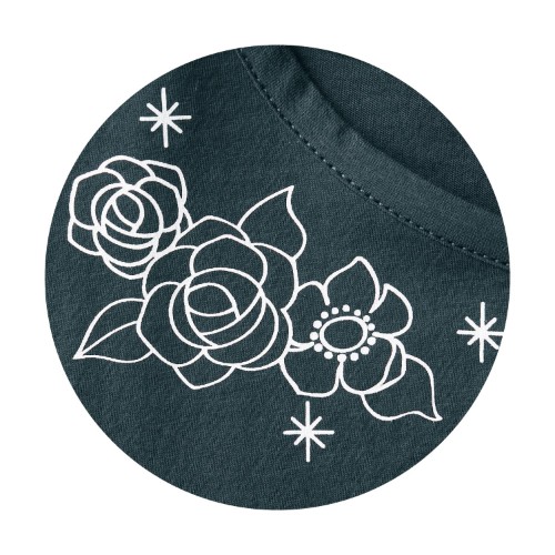 首元には華やかなお花のプリントが、