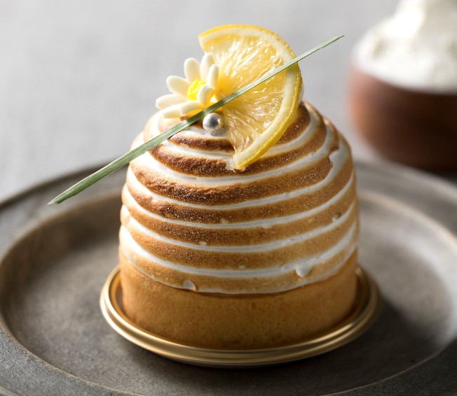 その上には、レモンクリームを閉じ込めたレアチーズムースを重ね、イタリアンメレンゲで覆っています。