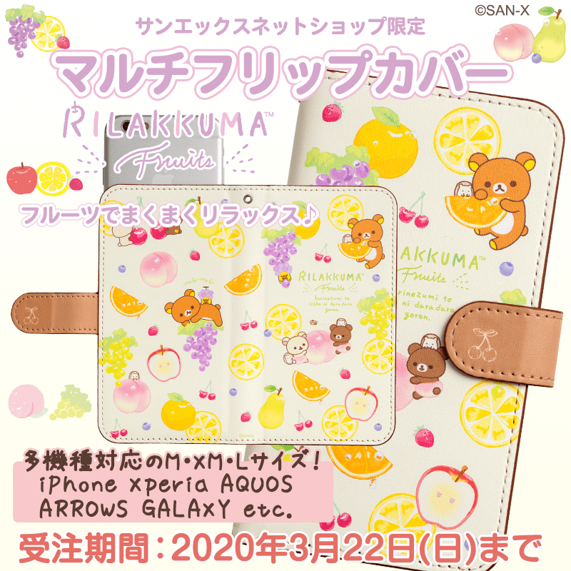 「フルーツでまくまくリラックス♪」シリーズの「マルチフリップカバー」は、サンエックスネットショップ限定で2020年3月22日(日)までの受注販売です。