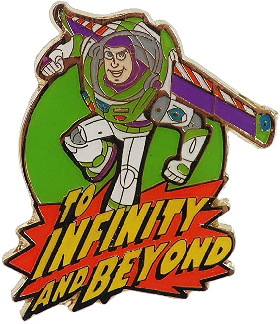 レーザー光線や飛びだす翼などの機能を備えたアクションフィギュア「バズ・ライトイヤー」デザインのピンバッジ。