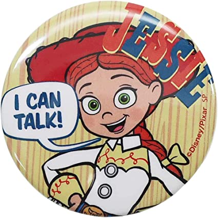 元気いっぱいのカウガール人形「ジェシー」デザインの缶バッジ。