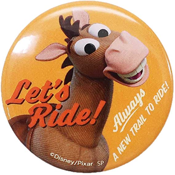 人懐っこい、ウッディの愛馬「ブルズアイ」デザインの缶バッジ。