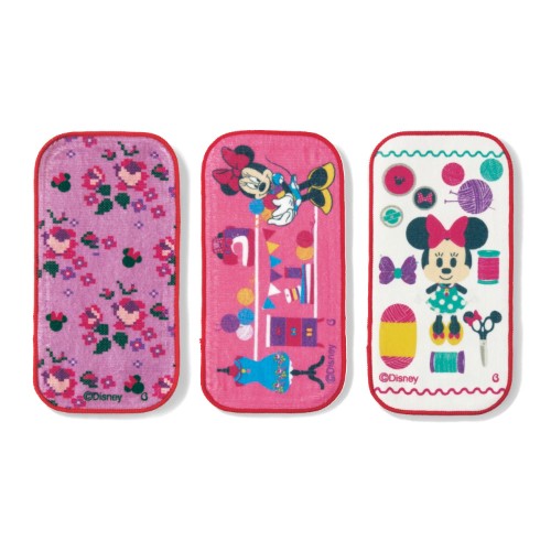 お花をあしらった大人っぽいテイストや、ワンピースを作っている「ミニー」のデザイン、そしてお裁縫道具に囲まれた「ミニー」の可愛らしいデザインの3種類がセットになっています!