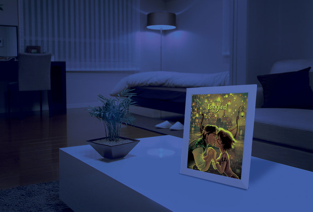 『塔の上のラプンツェル』のディズニープリンセス「ラプンツェル」と「フリン・ライダー(ユージーン)」のロマンティックなアートが魅力です。