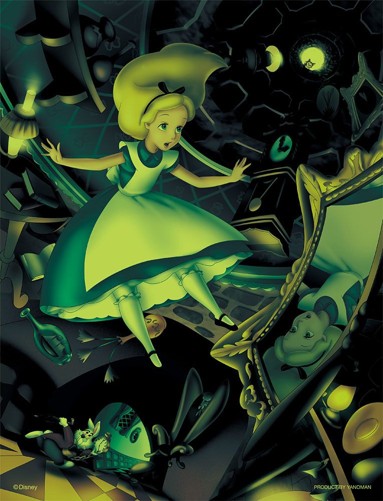 穴をのぞき込む「ダイナ」や時計を片手に先を急ぐ「白うさぎ」など、物語の冒頭をイメージさせる一枚です。