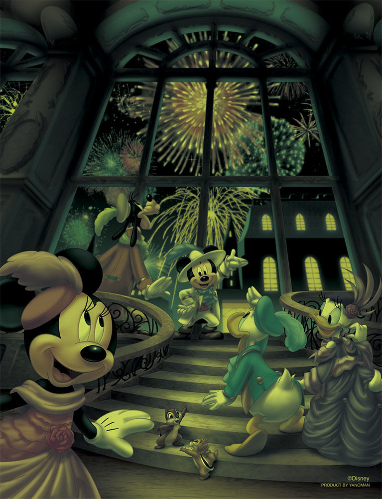 すてきな衣装を身にまとったミッキー&フレンズが、打ち上げ花火を眺めているデザインです。