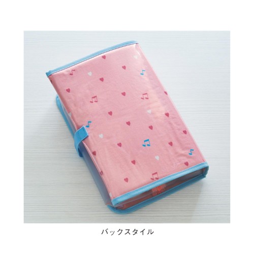 表と裏それぞれの背面には、ハートや音符などのキュートなモチーフが総柄でデザインされています。