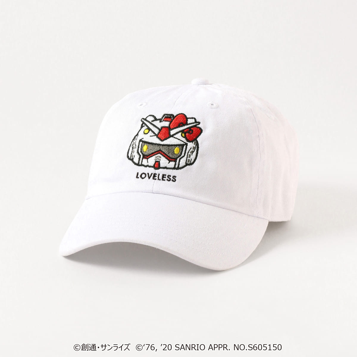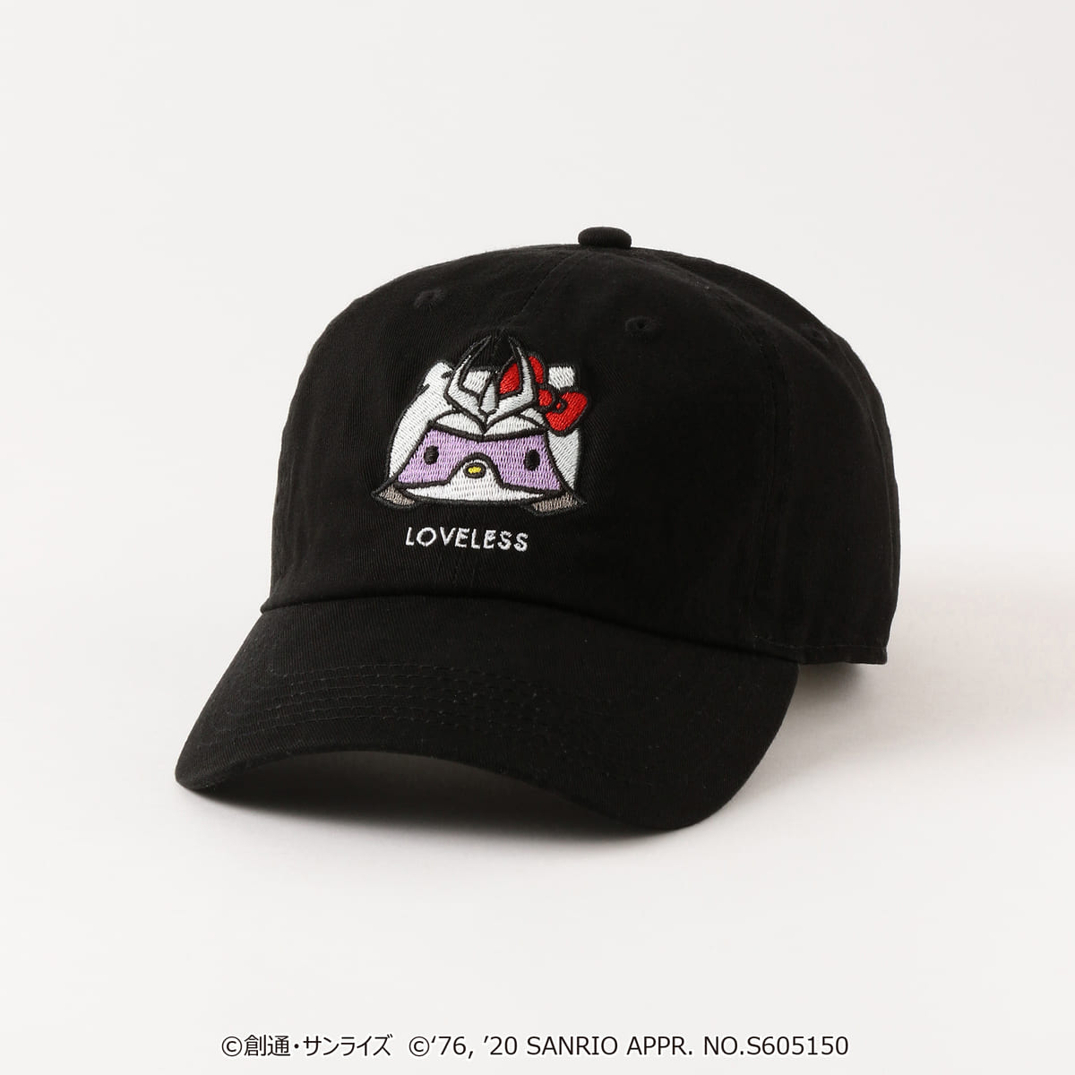 「ガンダム」のキャラクターに扮した「ハローキティ」と、「LOVELESS」のロゴがフロントに刺繍されたキャップです。