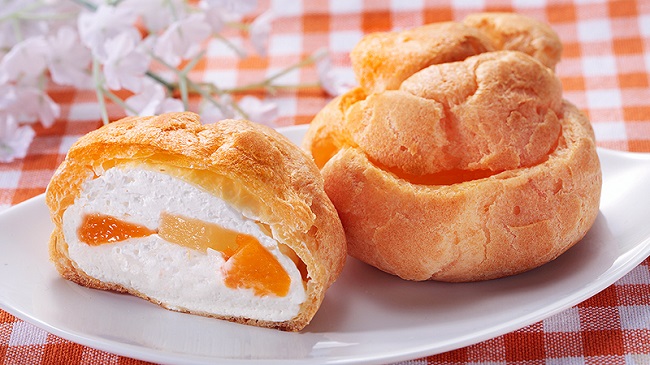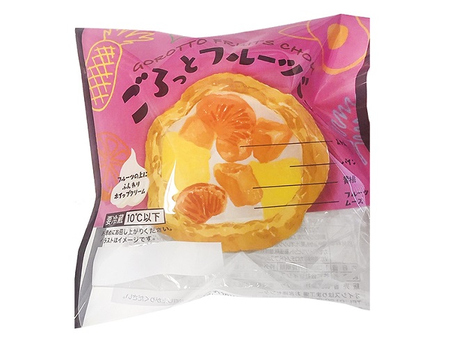 「ごろっとフルーツシュー」は、みかん・パイン・黄桃の3種類のフルーツが入った、贅沢なシュークリームです。