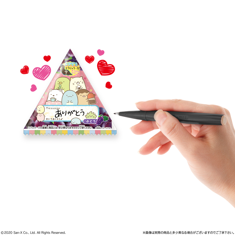 テトラ型のグミ「すみっコぐらし きもちぎゅ~っとカラフルグミです。」は、全国量販店の菓子売場などにて、リニューアルして販売中です。