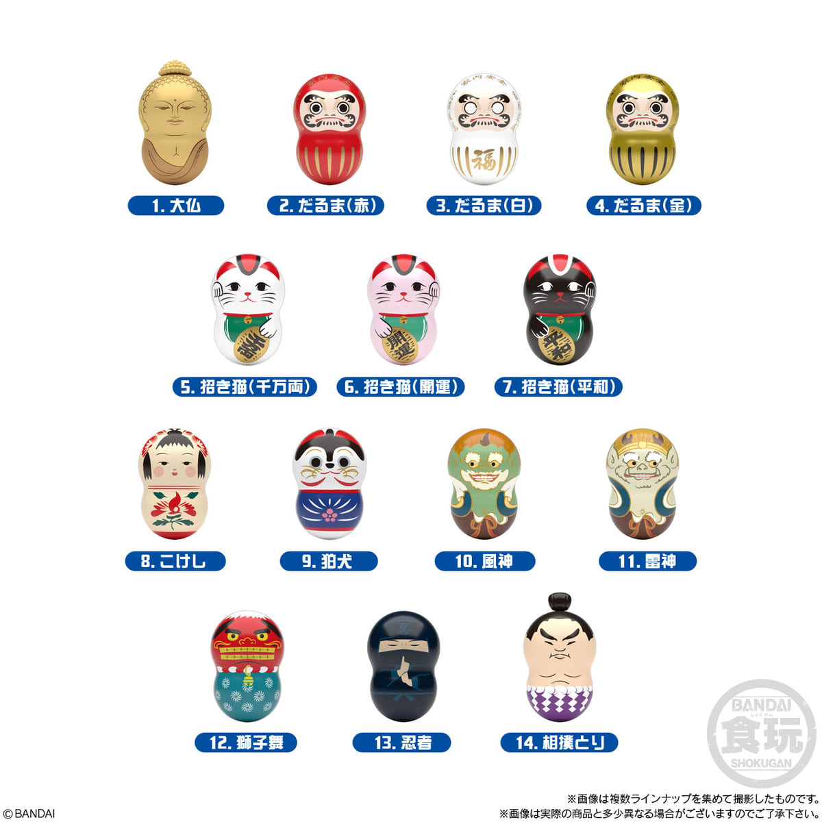 大仏やだるま、招き猫や獅子舞など、日本の歴史的なキャラクターや・文化を象徴するフィギュア全14種がラインナップ。