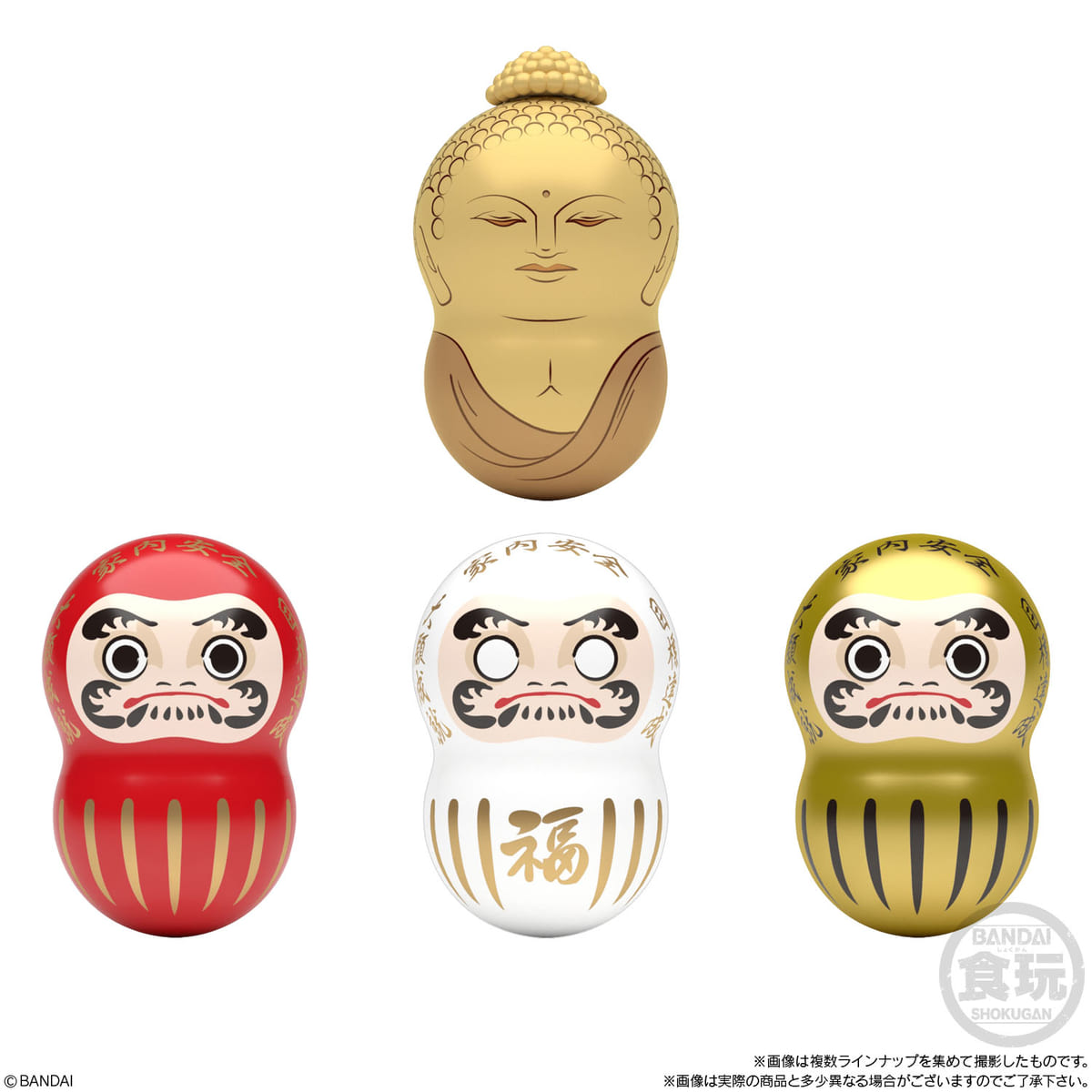 1.大仏、2.だるま(赤)、3.だるま(白)、4.だるま(金)