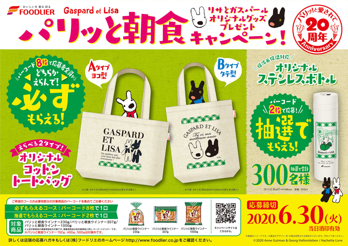 フードリエでは「リサとガスパール」グッズがもらえる「パリッと朝食ウインナー」プレゼントキャンペーンを実施。