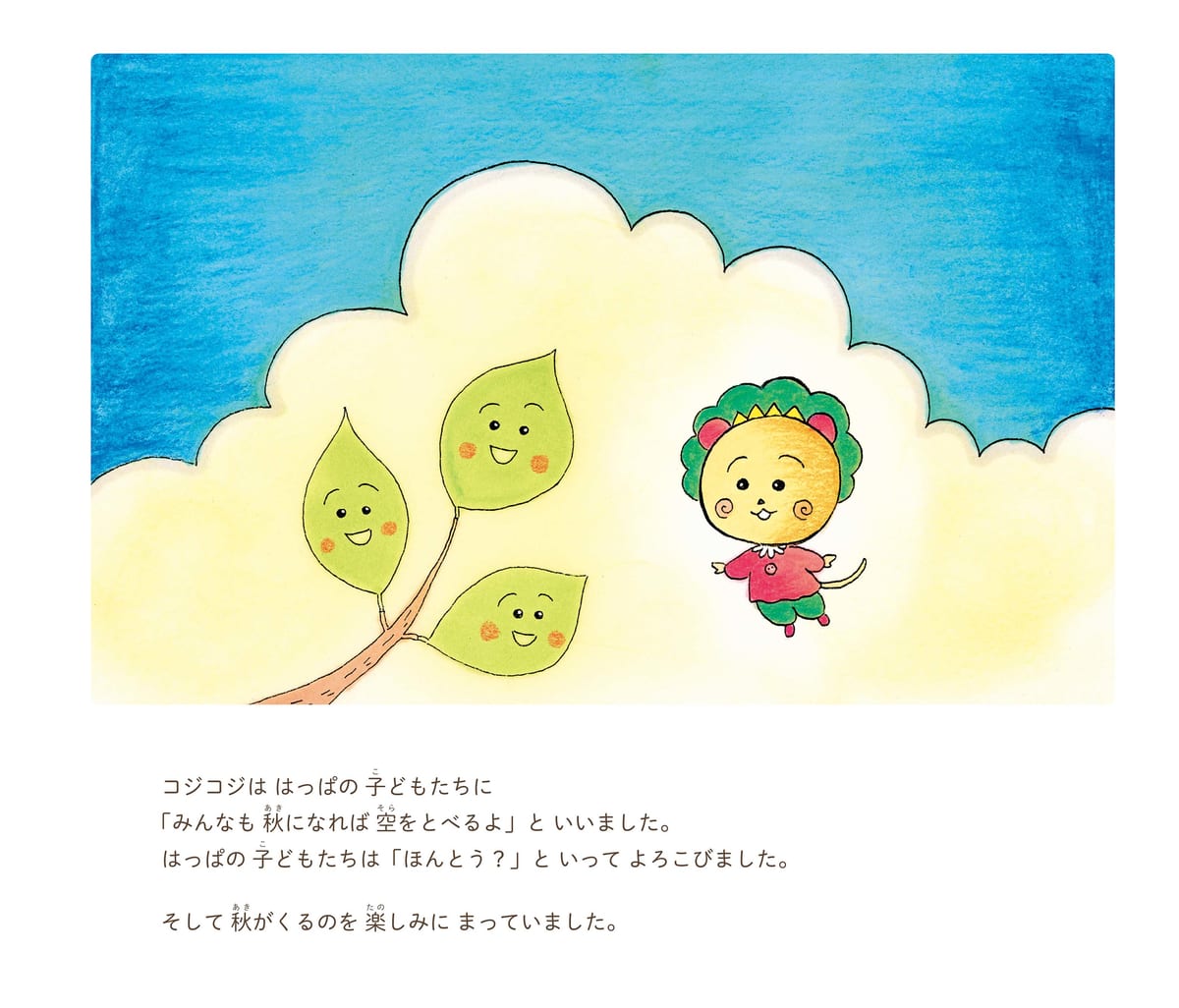 夏の間、「コジコジ」が空をとべるのを見て「いいな、ぼくらも空をとびたいな」という葉っぱの子どもたち。