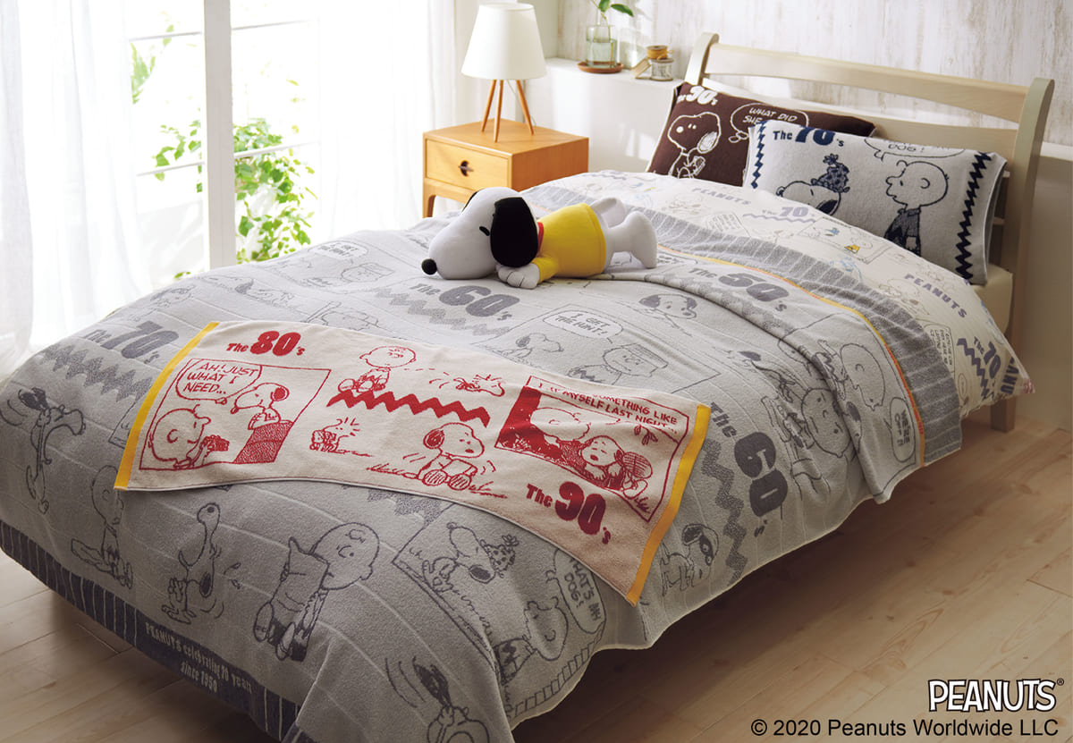 2020年春夏シーズンは、これを記念して、50〜70年代に描かれたヴィンテージアートや80〜90年代のクラシックアートを織り交ぜた、歴代の「スヌーピー」が大集合したデザインやレトロ感のあるカラーリングで70年の歴史が感じられるデザインの寝装品が登場。