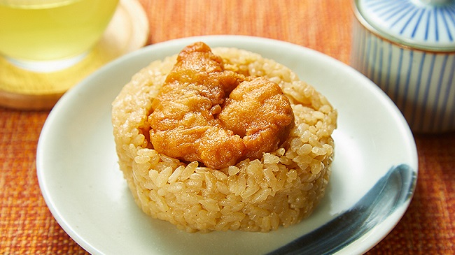 醤油ベースの味付けおにぎりに、生姜焼きのたれを絡めた唐揚をトッピング!