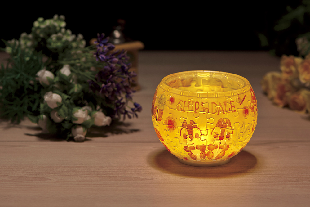 組み立てて専用LED台座に光を灯せば、キャンドル調のテーブルランプとなる「ランプシェードパズル」は、あたたかみのある優しい光でお部屋を静かに照らします。