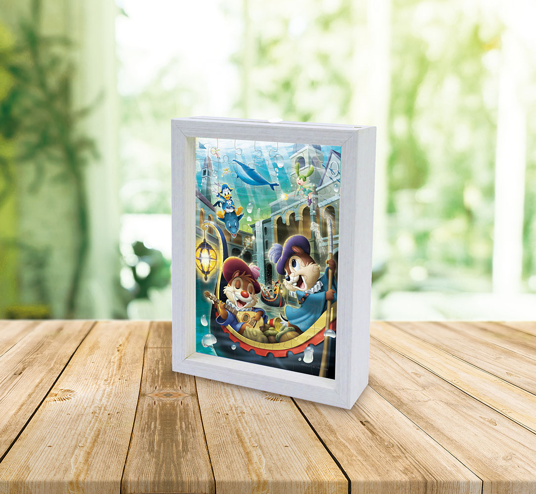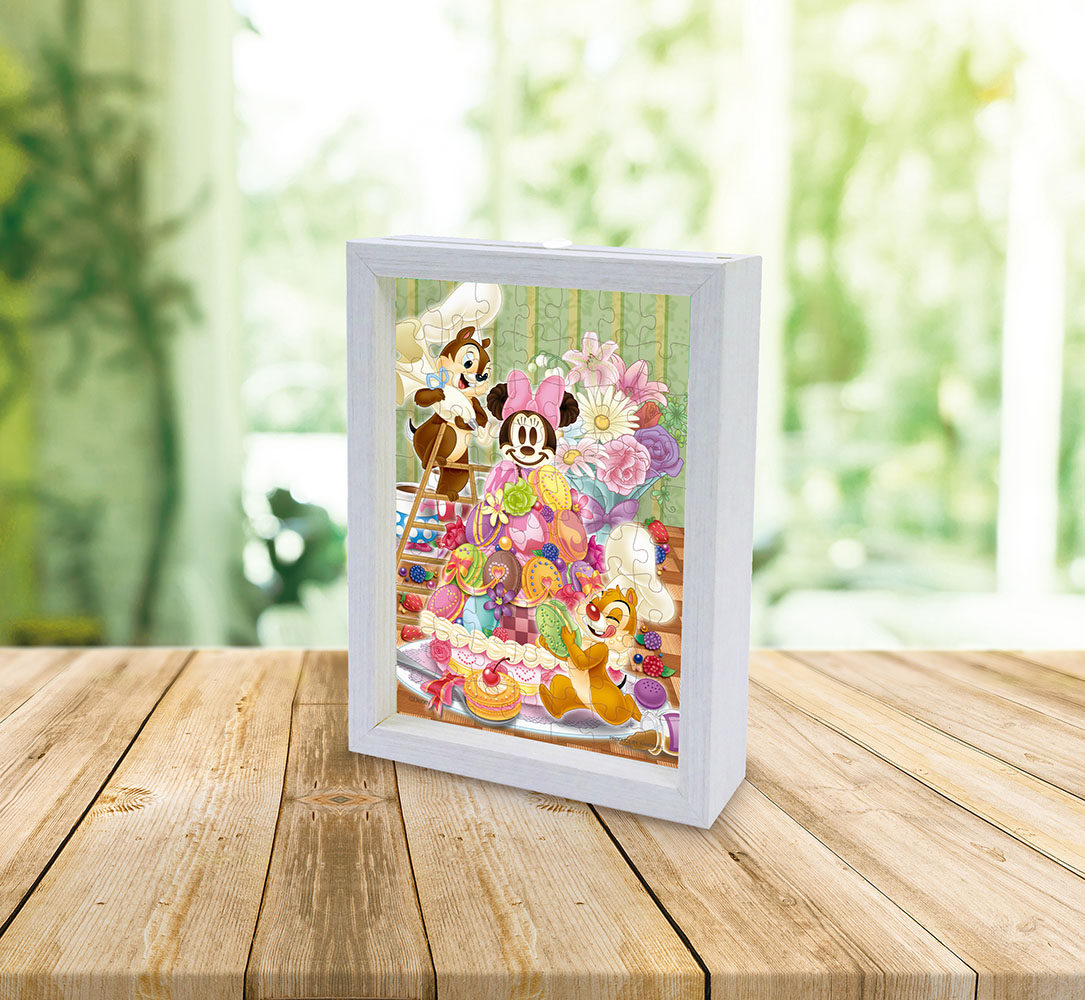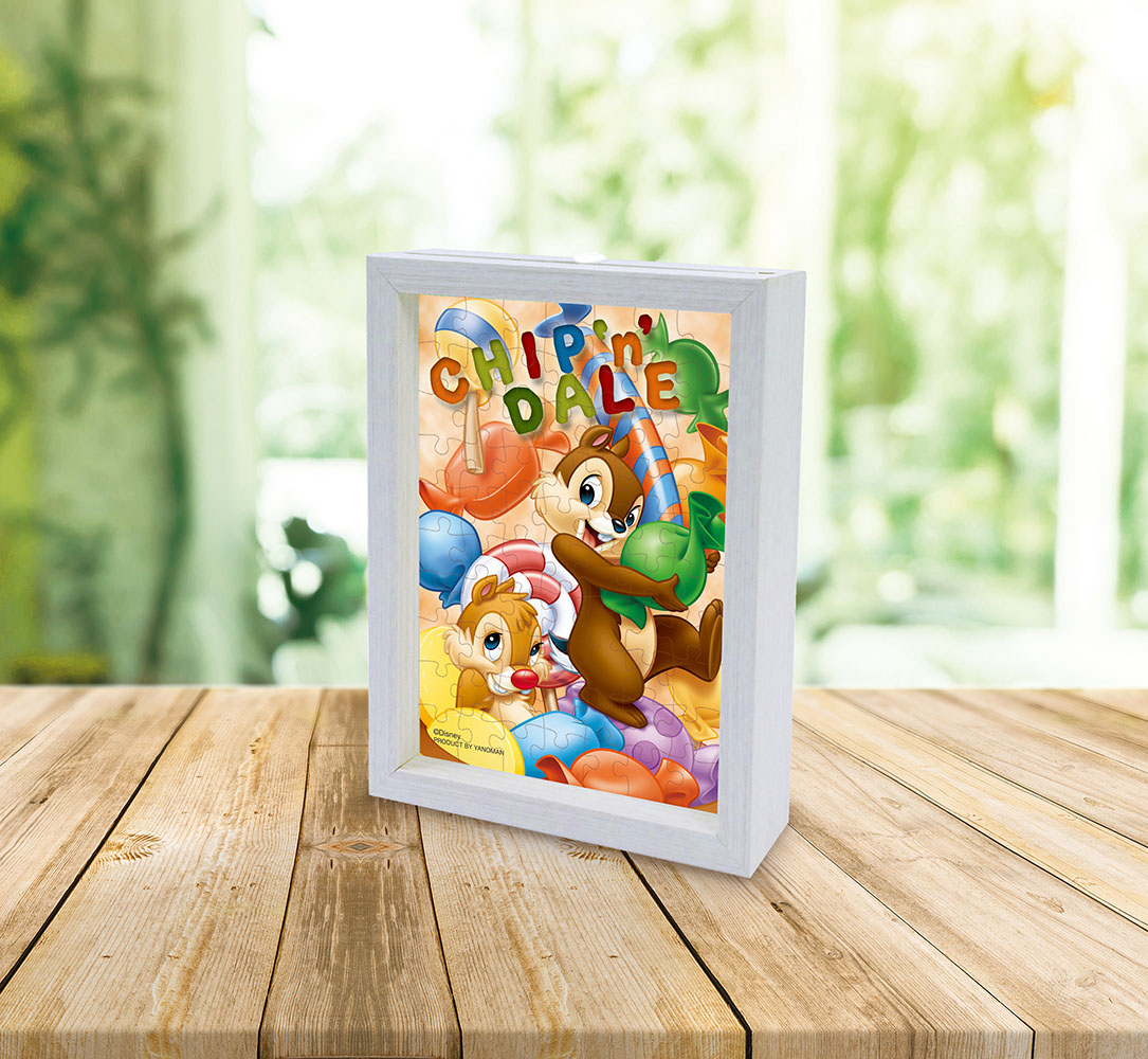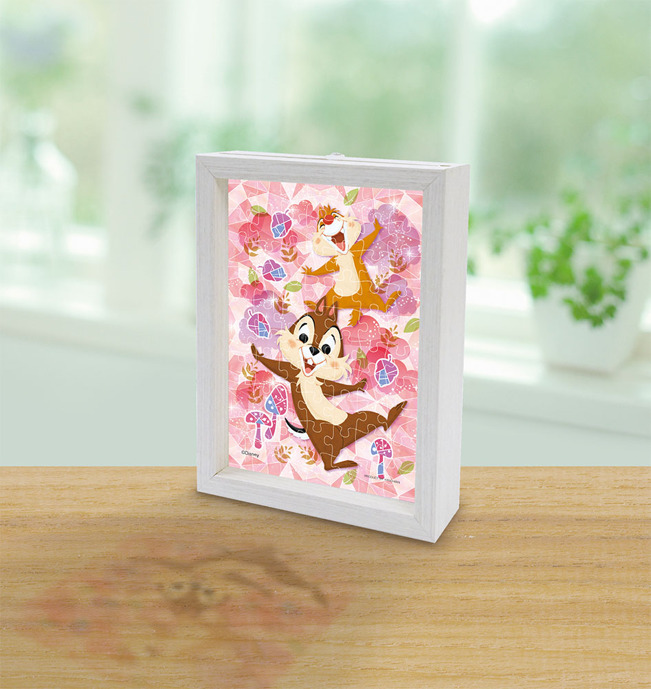 光が透過する透明ピースのパズルで、後ろから光を受けると「チップ&デール」をよりかわいらしく輝かせます。