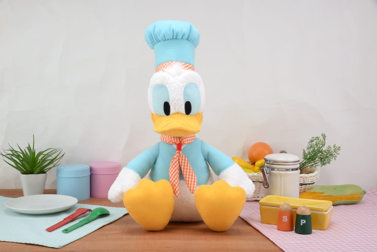 「ドナルドダック」がシェフの服装をした「メガジャンボシェフスタイルぬいぐるみ」